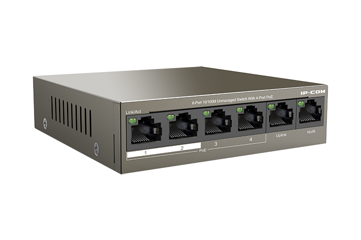 F1106P-4-63W is an unmanaged PoE switch with 2 uplink ports, independently designed by IP-COM. Compliant with IEEE 802.3at/af standards, it can identify PoE-powered devices intelligently. The switch supplies a maximum PoE power output of 63 W, and 30 W for a single port. Featured with extend mode and QoS function, F1106P-4-63W is a ideal choice for SMBs, supermarkets and restaurants with small-sized video surveillance requirement.