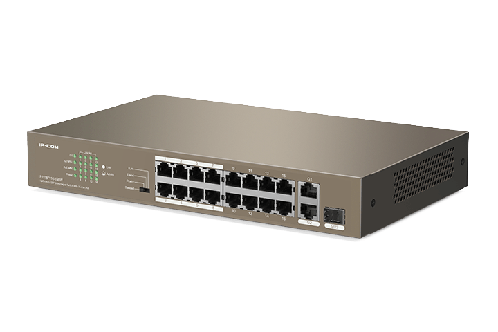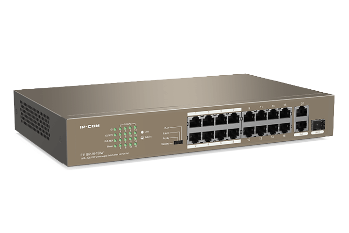 F1118P-16-150W is a unmanaged PoE switch independently designed by IP-COM. Compliant with IEEE 802.3af and IEEE 802.3at standards, it can identify PoE-powered devices intelligently. With a maximum PoE power output of 130 W, and 30 W for a single port, it can supply power when transmitting data with APs, IP cameras, and IP phones. The switch supports 4 working modes, including standard, priority, extend and VLAN modes, is an ideal choice for SMBs, hotels, schools, factories with video surveillance and wireless networking requirements.