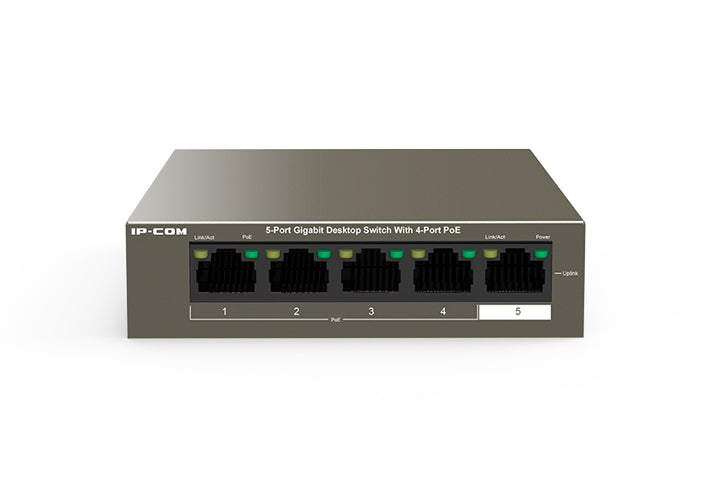 IP-COM 5PORT GIGABIT SWITCH 58W POE BUDGET 4x POE+ 10Gbps SWITCHING CAPACITY 7.4Mbps FORWARDING RATE L2 UNMANAGED OPERATE TEMP 0 ~ +45° BROWN METAL 240VAC/51VDC 26Hx100Wx100D (MM)