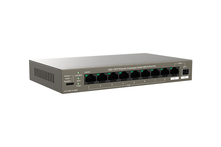 G1110PF-8-102W, 9GE+1SFP Ethernet unmanaged switch with 8-port PoE, is independently designed by IP-COM. It supports IEEE 802.3af/at standards for PoE power supply, capable of transmitting data and supplying power for 8 HD PoE cameras or gigabit APs. The maximum PoE output of a single port is 30 W and the total power consumption of the switch is 102 W. Supporting three-mode toggle, G1110PF-8-102W is suitable for complex networking deployment and is your ideal choice for video surveillance and gigabit wireless networking in such scenarios as SMEs, residential areas, industrial parks, hotels and schools.