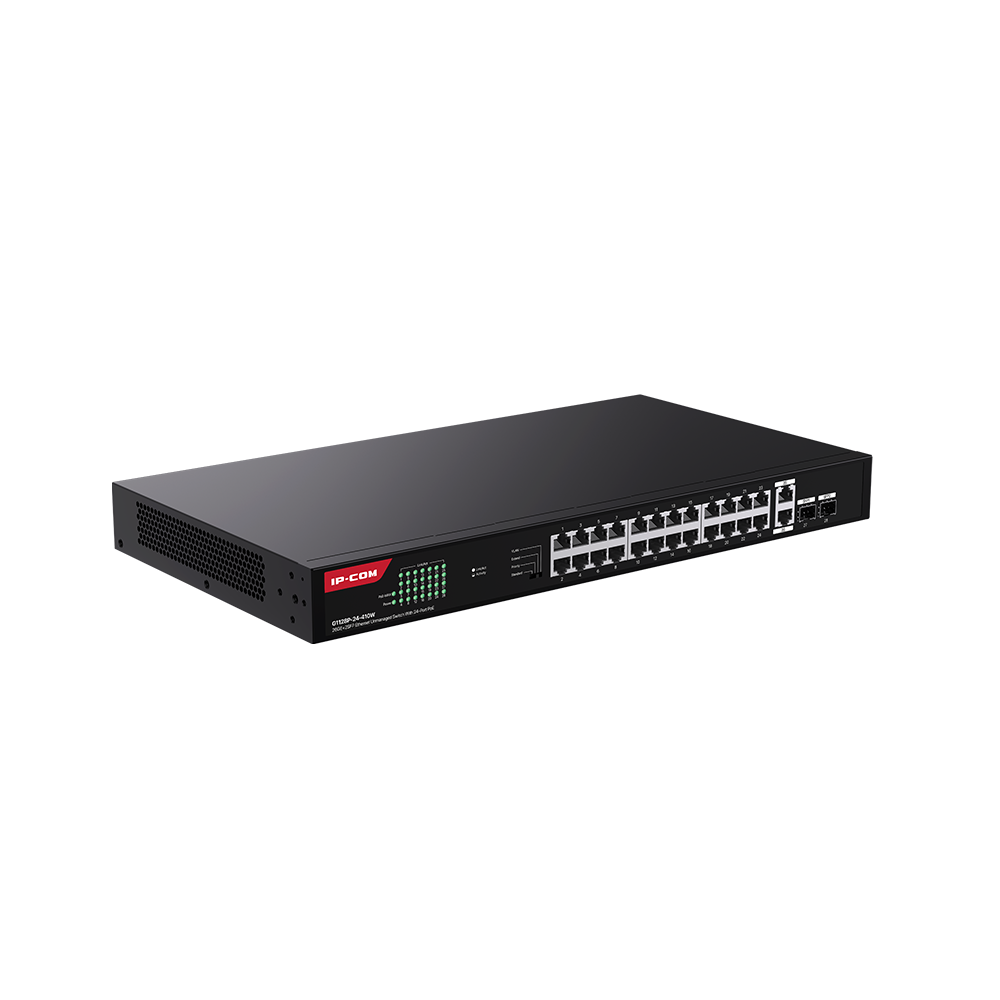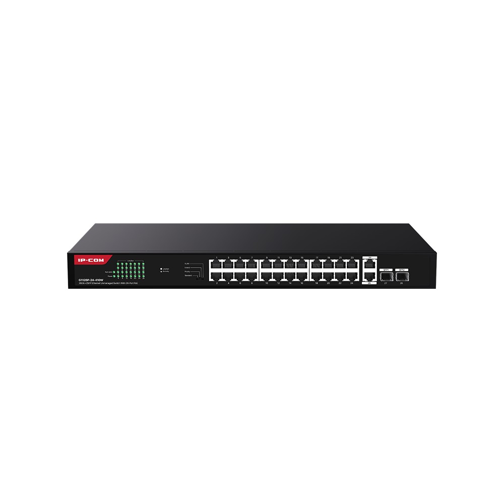G1128P-24-410W is a gigabit Unmanaged Ethernet PoE switch designed by IP-COM. The switch provides 24 gigabit PoE ports, 2 uplink gigabit RJ45 ports and 2 SFP ports. It supports the IEEE 802.3af/at standard and can automatically detect PDs and supply power. The maximum output power of a single port is 30W, and the power of the whole switch is 410W. It supports rack mounting, one-toggle settings, plug and play, and simple networking. It is an ideal choice for SMBs, hotels, schools, and parks with video surveillance and wireless networking requirements.