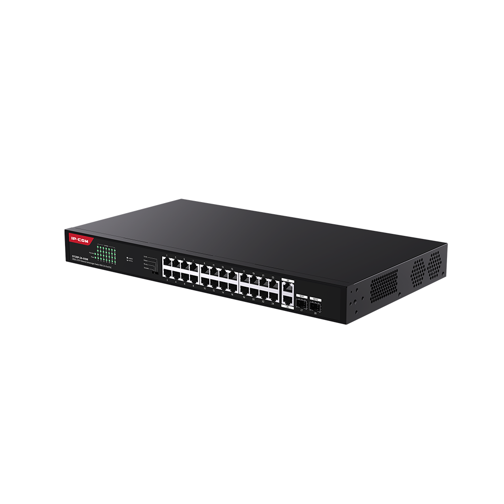 IP-COM 24PORT ( 28P) GIGABIT SWITCH 370W POE BUDGET 24x POE+ PLUS 2x 1G SFP/ FIBRE PORT 2x1G UPLINK 56Gbps SWITCHING CAPACITY 41.7Mbps FORWARDING RATE L2 UNMANAGED OPERATE TEMP 0 ~ +45° BLACK METAL RACK MOUNT 240VAC EXTENDED POE 44Hx240Wx440D (MM)